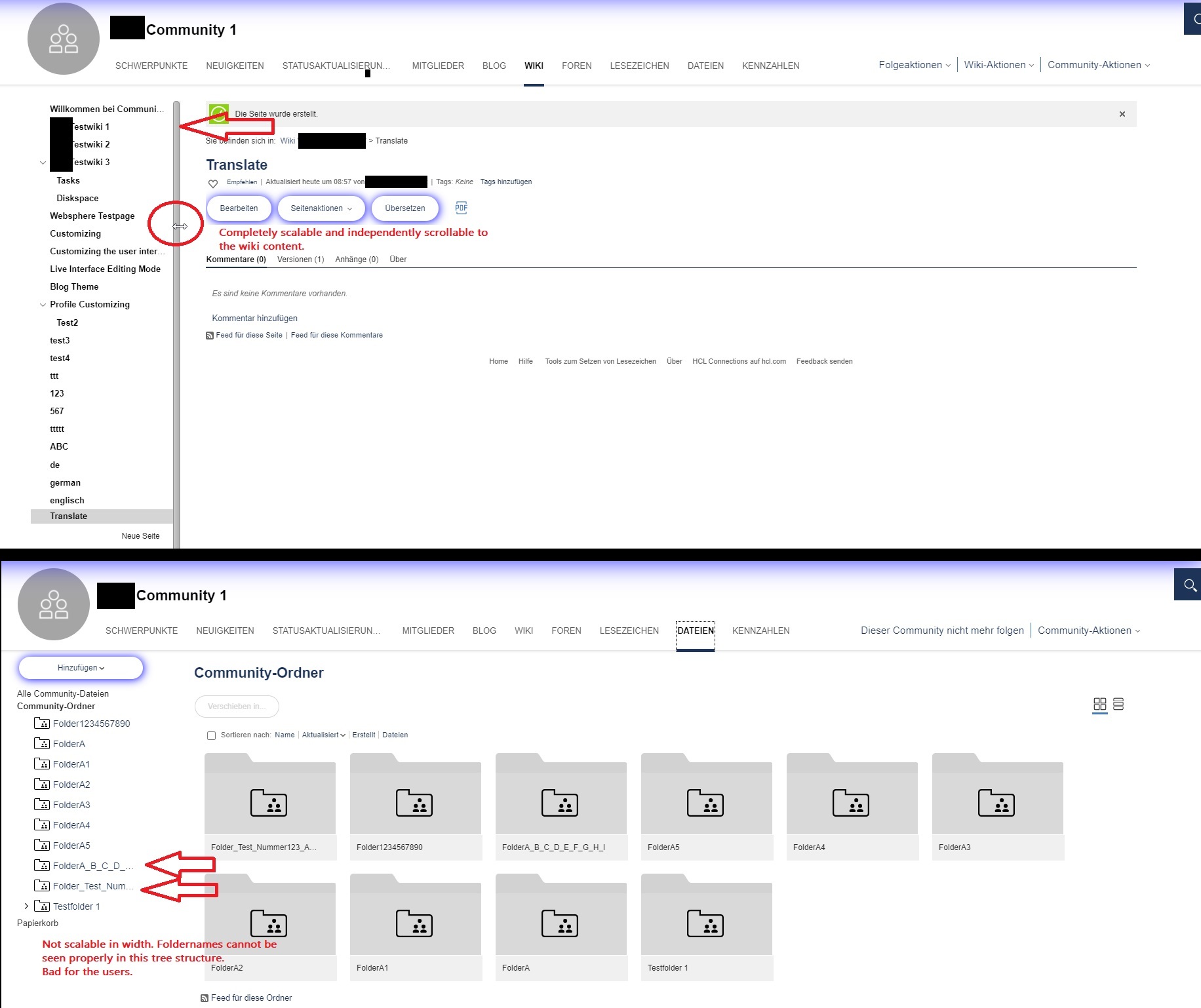 With us, the question and the desire to scale up the folder structure in the Files application always comes up. This is possible in the Wikis application since Version 6CR5. Users can move the left navigation bar independently of the actual wiki content and scale the width. This is fantastic for example to be able to read the whole wiki text on the left side. Why was this important feature implemented only in the Wikis application? In the Files application this is incredibly important if you have longer folder names and work with the tree folder structure. This feature should definitely be added!