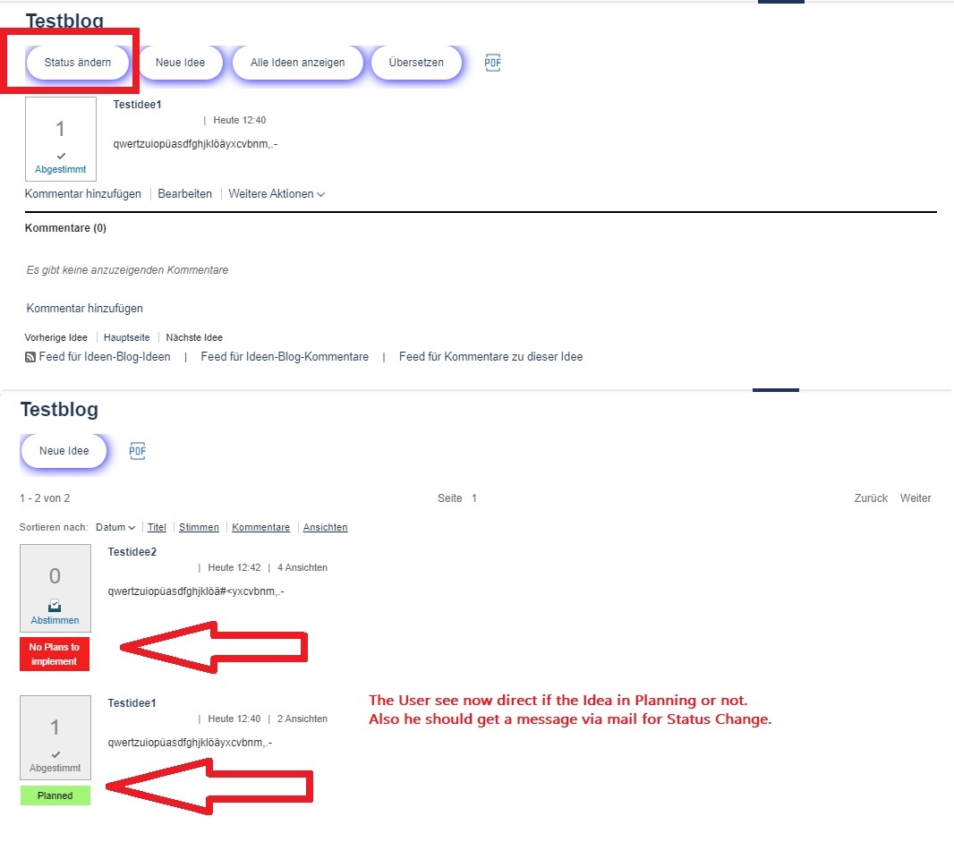 Give the Ideas blog more "status" possibilities like for example here in the Ideas Lab of HCL. Currently there is only the status "Graduated". Many users would find it great, however, if there is also the possibility, so that you receive a status change message via email whether the idea is implemented or not. Examples of custom status changes are, for example, here in the Ideas Lab "Planned", "Under Consideration", "No Plans for Future".