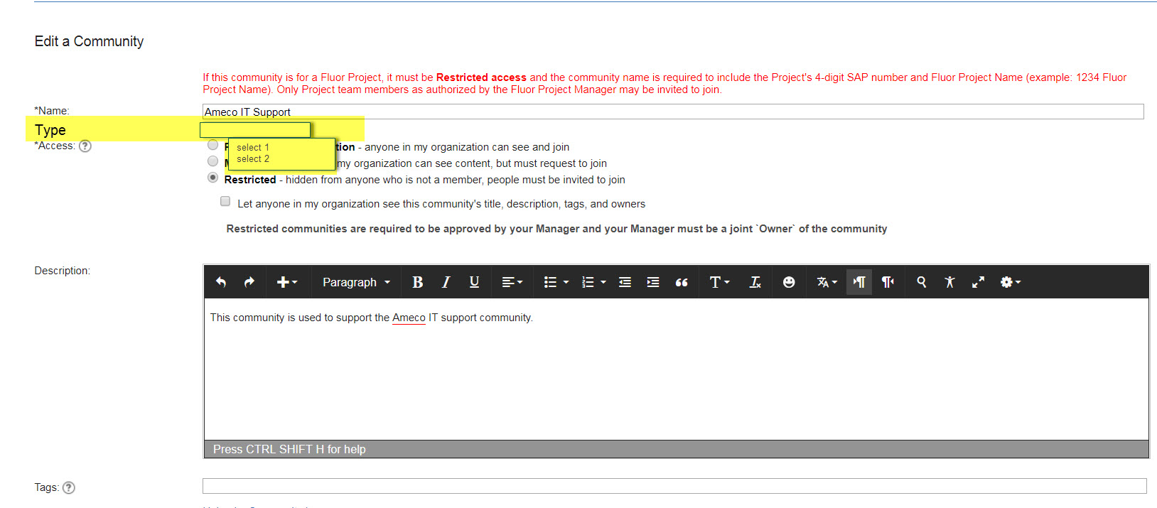 This typing allows administrators to identify the level of oversight required for the community as well as facilitating reporting on overall connections usage and adoption by type. In our case this drop down would contain selections such as "Overhead Group", "Project" ,"Charity", "Club","Communication","Government Contract" etc..